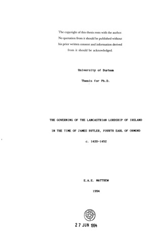 The governing of the Lancastrian lordship of Ireland in the time of James Butler Fourth Earl of Ormond.