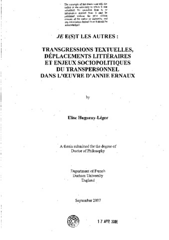 Je e(s)t les autres: transgressions textuelles, déplacement littéraires et enjeux sociopolitiiques du transpersonnel dans l'oeuvre d'annie ernaux