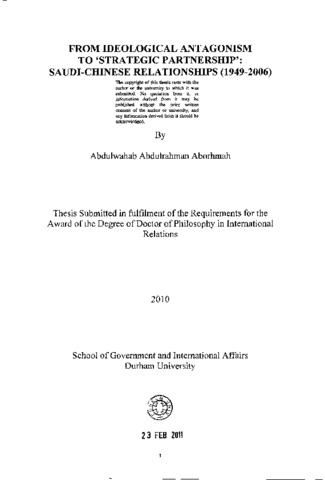 This study attempts to offer the first full-length account of the major dynamics and factors that contributed to shaping the Saudi-Chinese relationship during the period between (1949-2006). The Riyadh-Beijing relationship offers an unusual example in International Relations field since it has undergone various phases that started by a mutual political enmity and went through an extended process of confidence building with a reciprocal drive to construct a complementary strategic partnership. These phases have been divided throughout this study into eight distinctive periods. This study argues that Sino-Saudi relationships during the 57-year period were subject to the influence of various factors including those of systemic-security, normative ideological and economic complementary nature. It has been argued that the 41-year Saudi-Chinese political rupture was a product of a combination of systemic-security and identity-ideological factors that worked together to prevent Saudi Arabia and China from having diplomatic relations between (1949-1990). It has been, also, argued also that the reforms of 1978 as well as the pragmatisation of China's foreign policy, the improvement of the conditions of Chinese Muslims along with the resumption of Chinese hajj missions, and the indirect Sino-Saudi cooperation in Afghanistan against the Soviet Union and then the arms deal in 1986 have played an important role in normalising Riyadh-Beijing political relationship. It has been emphasised that the emergence of the potential strategic partnership between the two countries was a natural outcome of their economic, political and security complementary relationship that surfaced since the middle 1990s and that such relationship has benefited from the deterioration of US-Saudi relationship in the aftermaths of 9/11. Saudi-Chinese relationship in the 21'' century, it was argued, offers a comprehensive strategic partnership in all fields after two sides have found that what combines them is far more than what divides them and that they could be of much importance for each other in the years to come. This promising relationship would probably enhance China's political and strategic presence and role in the Middle East and might negatively influence the Western traditional predominant position in this important region.