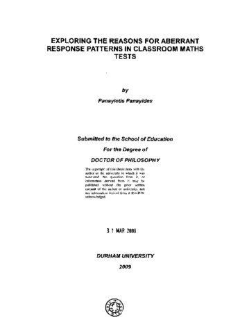 This study has focused on the investigation of the reasons for aberrant response patterns in classroom maths tests. Data were collected from high schools in Cyprus over two academic years. The assessment instruments used included: three Maths Tests, a Test Anxiety Inventory (TAI) and a shorter version of it, an Attention Deficit Hyperactivity Disorder (ADHD) scale and a Maths Self-Esteem Scale. Results showed no associations between any of the factors investigated and misfit when tests with polytomous items were used. Factors investigated included: student and teacher gender, item order, different schools, different teachers, ability, test anxiety, ADHD, maths self-esteem, motivation, language competency, interest in maths, private tuition in maths, study time and class revision. This finding has led to the investigation whether misfit is an inherent characteristic of students and the conclusion that it is not. The only factors that showed some association with misfit were ability (p = 0.022), the interaction of gender with test anxiety (p = 0.018) and different teachers (p = 0.027), and the first two were only for the test containing 12 (out of 16) dichotomous items. Further investigation of these factors is suggested. Analyses of interviews of 21 misfitting students showed that the main reason given for unexpected responses among high ability students was, as expressed by them, carelessness and among low scorers prior knowledge and to a lesser degree cheating and special preference. The two mean square statistics, infit and outfit were also investigated, and an explanation is given for why high infit is considered more of a threat to measurement than high outfit. The researcher finally argues that students with misfitting patterns with high outfit values should not be considered as invalidly measured without further investigation. Similarly, items with high outfit should not be considered as malfunctioning and removed without further investigation