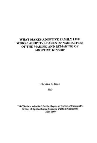 Adoption theory, policy and practice have undergone considerable change in the period between the introduction of the Adoption Act (1976) and the Adoption and Children Act (2002). In this period, in particular, adoption has increasingly come to be understood within the context of an ethic of 'openness'. This has had implications for the day to day lives of members of the adoption triad, that is, adoptive parents, adoptees and birth family members, and their attempts to 'make adoption work’ across their lifecourse. The thesis draws on theories of family and kinship in order to develop understandings of day to day family practices that emerge in adoptive families and the way these shape and are shaped by adoption discourse. The thesis provides an analysis of local and national statistical data and the biographical accounts of twenty two adoptive parents who had children placed with them between 1977 and 2001. These were all domestic 'stranger' adoptions. From the adopters’ narratives it was apparent that the core and ongoing challenge facing adoptive parents was to find a unique way of 'doing' adoptive family life which acknowledged the importance both of biological ties and legal kinship. This was the ease regardless of the year of the adoption and continues to challenge these families today. The thesis explores the tasks which flow from this core challenge, that is, developing and maintaining family relationships between adopters and adoptees where none previously existed, finding a place for birth relatives within the adoptive kinship model and developing a positive identity as a non conventional family. The thesis challenges the conceptualisation of adoptive relations as 'fictive kinship' and biological connectedness as 'real' kinship and presents evidence of the fragility of both the biological family and the adoptive family where there has been a legal adoption of a child. At the same time the thesis reveals the ability of both biological and adoptive family ties to endure over time despite cultural barriers. The study also reveals that existing typologies of adoption as 'confidential', 'mediated' and 'fully disclosed' fail to capture the complexity of adoptive family life. A new definition of both adoptive kinship and 'openness' in adoption are developed and the implications of these redefinitions for adoption policy and practice are explored
