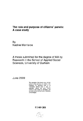 Central government has been consistent in its rhetoric about the need for local authorities to consult and engage with local people in decision-making since the implementation of the Local Government Modernisation Agenda. Local authorities have responded to this and other imperatives by providing a range of participation opportunities for local people. Citizens' panels are one such approach that has risen in prominence since 1997.This thesis considers the expectations and implementation of citizens' panels and their future role with reference to a detailed examination of a case study panel and emerging national policy. The case study draws on my own experiences and observations as practitioner-researcher, documentary analysis, interviews with council officers and a survey of panellists. The study reveals that in common with other local authority panels, the panel did not achieve some of the initial expectations and suffers from some of the wider difficulties experienced by public participation. The panel has however found a role for itself and succeeds in getting a large group of people more involved in local government. The study concludes that there is potential to build on this and in doing so help to deliver on the national policy agenda and better achieve panellist expectations. The panel can only truly flourish however if some of the unresolved issues regarding public participation are addressed including the extent to which central government and the local authority create an environment in which the benefits of public participation can truly be met and the extent to which local people respond to this.