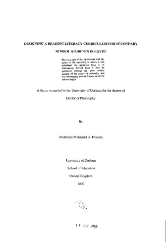 The key contribution of this research is to produce a proposal for a reading literacy curriculum design (RLCD) for secondary school students (15-17 year-old) in Egypt. This proposal includes four major components: targets, assessment, instruction, and content. Two complementary dimensions are investigated: the theoretical analysis (the researcher’s perspective based upon analysis of reading literacy research) and the fieldwork (the empirical study using a questionnaire for teachers and supervisors and a semi-structured interview for other professionals). Those two dimensions are charted through seven chapters and introduction to and conclusion of these chapters. Following an introduction to the research problem, purposes, questions, structure, rationale, and parameters, the successive focus of these chapters is on: - Clarifying the Egyptian context in terms of education system, culture of learning, critical analysis of the actual reading situation and how all of these elements reveal the gap between 'what is' and 'what ought to be' in RLCD in the secondary school in Egypt (Chapter one);- Reading literacy theory: the concept of reading literacy, dimensions, and models and how these can be used a baseline for RLCD (Chapter two);- Theoretical analysis of reading literacy targets and assessment, the first two components of RLCD (Chapter three);- Theoretical analysis of reading literacy instruction and content, the other two components of RLCD (Chapter four);- Research methodology, where survey design was employed and mixed methods were used: a questionnaire and a semi-structured interview. The major aim was to collect data to find out if the practitioners (i.e. secondary school teachers and supervisors) and other professionals (i.e. specialists in curriculum and instruction) in Egypt agree with the reading literacy research (chapter five);- Data analysis, where a descriptive statistical analysis was conducted for data provided by the questionnaire and a cross-sectional or code and retrieve analysis strategy was applied for data provided by the semi-structured interview. Results indicated that the practitioners' perceptions on the questionnaire and the professionals' answers in the semi-structured interview supported what was revealed by the theoretical analysis regarding RLCD. This suggests that the proposed RLCD is a practical proposition and it is timely to do it. It also raises the confidence in RLCD by triangulation of data by using the questionnaire for the practitioners and the semi-structured interview for other professionals and relating all of this to literature analysis (Chapter six);-Developing the proposal (RLCD): its scope, framework, and components: targets, assessment, instruction, and content. The researcher combines all sources of data: the theoretical analysis, the questionnaire data, and the semi-structured interview data (Chapter seven).The conclusion of the research is introduced. It presents a summary of the research and most importantly, it provides a summary of the contribution of the present research to reading literacy curriculum in theory and practice. Deriving from its results, some recommendations for practice and further research are made and a closing reflective epilogue on the research and the researcher is provided.