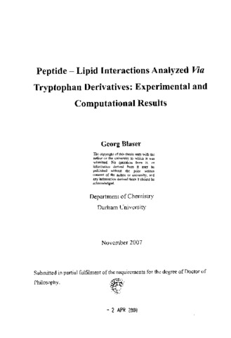 Tryptophan analogues have been shown to play an important role in the binding and anchoring of peptides in lipid membranes. Mono-substituted tryptophan derivatives were synthesized to study the importance of the relative contribution of electrostatic, quadrupolar and induced dipolar interactions to binding. Binding constants for the adduct formation of amino acid derivatives, lipid molecules and water with themselves and each other were analysed on a molecular level both experimentally, using NMR host-guest titrations and isothermal titration calorimetry (ITC), and computationally via molecular dynamics simulations. Free-energy calculations support the data presented and allowed a quantitative comparison. When free energies of the association of 5-monosubstituted tryptophan analogues (Figure 0.1) with DMPC lipid molecules were plotted against a measure of electron density of the indole ring (the Hammett parameter), an n-shaped pattern was observed. Binding was found to increase for substituted amino acid derivatives with maximal responses for the most electron withdrawing (5-nitro) and the most electron donating (5-methoxy) compounds. This trend was seen both in the titration-data and in the molecular dynamics simulations. The latter allowed the sampling of preferred binding conformations and a determination of the importance of hydrogen bonding and cation-π interactions for and in adduct formation. Additionally, amino acid analogues were incorporated into a model peptide (AcWLWLL) to study the electrostatic effects of the substituent's on the peptide-lipid interactions in the biologically important lipid bilayer environment.