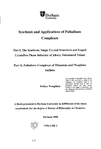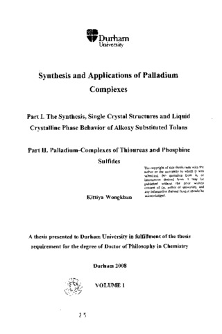Synthesis and applications of Palladium complexes Part I. The synthesis, single crystal structures and liquid crystalline phase behavior of Alkoxy substituted Tolans. Part II. Palladium-Complexes of Thioureas and phosphine sulfides