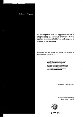 The evolutionary origin of allogrooming behaviour is generally accepted to be hygiene. In recent years this function has received little interest from scientific research while the relatively new social functions are repeatedly studied in a wide variety of species. The discussion of allogrooming having multiple functions (namely in primates) has been reviewed numerous times; however, hygiene is often ignored or is considered through implicit reference only. The aim of this investigation was to examine the importance of hygiene in the allogrooming behaviour of capuchin monkeys (Cebus apella). This species has never before been thoroughly studied for allogrooming in the context of hygiene. Previous work by Pérez and Veà Baró (1999) examined the hygienic function of allogrooming in the white-crowned mangabey (Cercocebus torquatus lunulatus) and gave evidence supporting this function. Their analyses were marred by the use of percentages in a chi-square test. This investigation repeats the analysis of Pérez and Veà Baró (1999) with the intention of highlighting these errors and providing suitable alternative approaches to data analysis. In doing so the study provides significant data in support of grooming for hygiene. These results are based on a large sample size (5 focal females, 153 hours of observations) and show a high level of grooming activity. The focal females observed were involved in alloG bouts for 5.94% of observation time. The work by Pérez and Veà Baró (1999) and the current investigation support the evidence of Barton (1983a, b, 1985) and Hutchins and Barash (1976) for the importance of hygiene in primate allogrooming. The study also shows that the support for the hygienic function does not discredit any of the alternative functions hypothesised. Indeed, the data suggest that other "more social” functions are in operation and can be seen in the variation between individuals and across observation periods. A discussion of the multiple functions of grooming and consideration of a "multiple functions" hypothesis will also be made in this investigation. It will also be discussed how allogrooming, in the context of hygiene, can benefit both the groomer and groomee without the need to invoke models such as reciprocal altruism or kin selection.