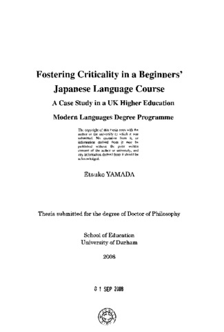 This thesis examines the development of criticality based on an empirical study in beginners' Japanese language courses within a UK Modem Languages Degree Programme. A starting point for this study is Barnett's (1997) claim concerning the significance of fostering criticality and setting educational aims against the current trend of mass education at the Higher Education. The empirical base is inspired by the Criticality Project by the University of Southampton which, also based on Barnett's model, investigates a whole Modern Languages course. This thesis, however focuses on the phases of Modern Language Studies which have not been explored: beginners' level language courses with the example being a n on-European language. The examination of the current issues of Modem Languages Degree Programmes illustrates the fact that there is a problem of a lack of coordination of the diversity of various components within programmes. The nature of language modules, especially at beginners' level, inclines to the acquisition of practical language skills focusing on grammar rather than on 'content', and widens the gap from academic content modules. In this thesis, the notion of criticality is highlighted as a single 'linkage' connecting each component to others. This issue needs to be examined from two perspectives: the empirical study of criticality development in beginners' level language courses and the theoretical concept of criticality. Action Research was conducted in beginners' Japanese language courses at a Modern Languages Degree Programme where the researcher was teaching. Lessons with activities which target criticality development in cultural and language dimensions were inserted in the existing grammar based language course framework. The observations of beginners' level language lessons in other institutions ensured the aims and syllabus of the normal lessons of the target courses have the same standard as them. Various types of qualitative data were collected. Among them, particularly the participants' output data; group interviews and post-lesson questionnaires became the main sources of analysis of this study. The analysis of empirical data made two important resources for criticality visible: skills and knowledge. Skills appeared as the students' theory building process comprising three stages: inquiry, analysis and conclusion. The concept of inquiry stage corresponds to inquiry and scepticism which was highlighted by a review of Critical Pedagogy and Critical Thinking. From these examinations of two perspectives, one from empirical and another one from theoretical, the fundamental concept of 'being critical' is defined as inquiry and scepticism. During the theory building process, various kinds of knowledge are employed, and the students' theories were presented according to nine thematic categories comprising culture, language, and learning process. The factors contributing to the development of criticality are found to be cultural and linguistic dimensions and also the learning process itself. The analysis of empirical data also highlights the existence of criticality specifically in the language modules and that criticality could work as a connection among the components of Modern Languages Degree Programme. Barnett's theoretical criticality model of domains and levels is supported by the empirical data, but they also showed that criticality development does not appear in a neat order nor the steady progression from lower to higher levels as in his framework. It is concluded from this study that both instrumental and educational aims can be and need to be compatible in language modules even at the beginners' level and all the components of Modern Languages Degree Programme need to be connected by a single linkage, criticality, which realizes an educational aim of the Modern Languages Degree Programme. However, it also implies that further research is needed to bring the issues to the level of curriculum development.