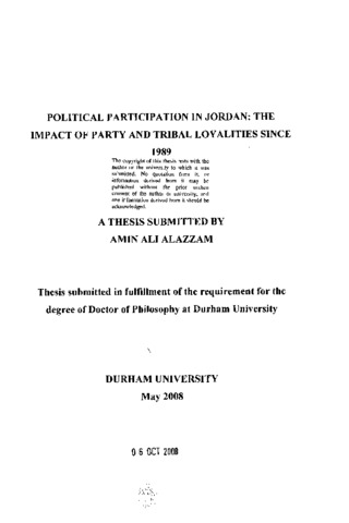 In the light of the internal and regional crises in the 1980s, Jordan found itself under pressure, and various ideological and political factors pushed the country towards political reform. As a result, Jordan has undergone several transformations, and a certain degree of political liberalization has made political participation the main objective of the Jordanian political system and its various institutions. This development in turn has required participation of all segments of the society, including political parties, minorities, and women. This participation demonstrates how far the political system has been liberalized. Therefore, nobody can argue that there is no political participation in Jordan. However, important questions remain. What is the form of this participation? What is its scale? What factors influence political participation, and what are its main objectives? Therefore, the purpose of this study was to explore the issue of political participation in Jordan. In particular, it investigated the impact of party and tribal loyalties on political participation in Jordan since 1989. This is undertaken through examining the basic forms of political participation, particularly participation in parliamentary elections. Accordingly, this study is divided into two main parts. The first part aims to shed light on the historical development of Jordanian parliament, electoral laws and systems, and political parties' participation and in addition to examine these in context of the socio-economic, political, and cultural environment. The second part was carried out through a survey involving the distribution of 400 questionnaires to five groups of political elite in Jordan. It is concluded in this study that despite the fact that political parties in Jordan date back to the establishment of the state in 1921, the social relations of kinship and the tribe are still dominant and constitute the main motives for Jordanians to participate in parliamentary elections. Several factors explain this, but it is argued here that the most important is legislations, particularly the emergency laws which have heavily restricted political freedoms and activities.