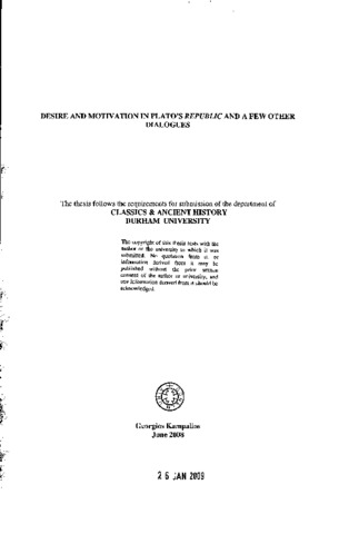 My thesis concerns Plato's theory of human motivation and action in the Republic. My aim is to try to investigate how and to what extend the tripartite division of the soul into reason, appetite and spirit explains human action and behaviour. I shall concentrate mostly on the appetitive part of the soul and discuss how and in which cases this part affects the character and the dispositions of human beings. In my first part (ch.1-2) I investigate the nature of this part of the soul arguing that it is totally deprived of any kind of cognition and incapable of motivating actions on its own without the involvement of reason. In my second part (ch.3-5) I present an analysis of the story of Leontius in R. IV which illustrates an instance of human behaviour that seems to suggest that the desires of the appetitive part can motivate action despite reason's resistance. Then I discuss the role that Plato attributes to appetite in his description of unjust souls and the way that the appetitive part is related to reason in the soul of the non-virtuous person. Finally through my discussion of the ideal soul of the philosopher I sketch the minimal role that the desiring part has in human motivation and ethical perfection. In the last part (ch.6) I provide a brief account of the so-called 'Socratic' thesis of human motivation as it appears in the Protagoras. My point is that despite some apparent differences the two theories have a substantial similarity.