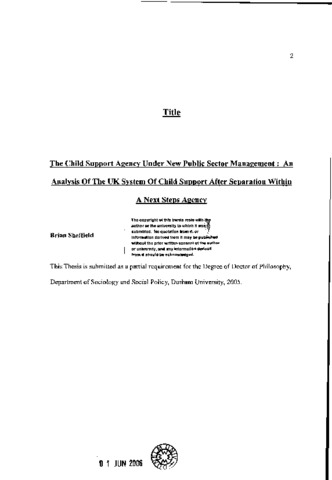 The subject of child support is one that crosses the boundaries of many academic disciplines, not least public and social policy. The formation of effective child support policy and the efficient implementation are fundamental requirements in order to sustain a fair and workable system for the provision of financial maintenance for children after the separation of their biological parents. This study considers the combination of changes brought about by the themes of new public management in the introduction and implementation of a controversial child support policy and the subsequent execution of child support legislation by the Child Support Agency. The emphasis is made on the Child Support Agency as a Next Steps Agency in analyzing its internal organization and operational performances within the themes of new public sector management. In this study comparisons are made between what child support policy was intended to achieve under the principles of new public sector management and the actual outcomes that have been realized