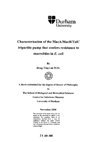 Characterisation of the MacA/MacB/TolC tripartite pump that confers resistance to macrolides in E. coli