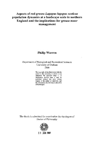 Red grouse Lagopus lagopus scoticus are an important game species in the United Kingdom, with many areas of heather moorland managed specifically to produce them for driven shooting. In order to effectively manage red grouse populations it is important to have an understanding of their population dynamics and to determine which of the vital rates most effect population growth and recovery and whether these parameters can be influenced by management activities. The focus of my research was to provide a greater understanding of the respective roles of juvenile dispersal, heather management and mortality causes in red grouse population dynamics at a landscape scale in northern England. The study was undertaken between 1999 and 2005 and encompassed four privately owned grouse moors, covering some 113 km(^2) of heather dominated moorland. Central to my research was the ability to accurately and efficiently survey the distribution and abundance of red grouse across the study area. To facilitate this I evaluated a distance sampling method to survey red grouse across the study area pre-breeding in spring and post-breeding in summer. The distance sampling technique proved a reliable, repeatable and practical method for extensive surveys of red grouse. Grouse distribution data were used to construct spatial patterns of grouse abundance at a moor scale using a geostatistical interpolation technique. Rotational heather burning is practised by grouse moor managers to create a mosaic of heather ages which provide food, shelter and nesting habitats for red grouse. To assess the spatial and temporal effects of heather burning on grouse, I used an earth observation technique, using satellite remote sensing to map the habitat mosaic across all four study moors in 2000. Temporal effects of heather burning, from 2000 to 2005 were studied on one moor, with annual heather burning mapped annually. Dispersal is an important element of population dynamics which influences population growth and spread, gene flow and disease transmission. I used radio telemetry to investigate the timing, frequency and distances of dispersal in juvenile red grouse. Dispersal distance differed between sexes, with juvenile females dispersing on average 861 m (±120 SE) compared to 343 m (±31 SE) recorded in males. Population growth did not appear to be limited by dispersal and abundance increased until the density dependent effect of the parasitic nematode worm Trichostrongyle tenuis caused a population crash. On the study moors, grouse moor management resulted in rapid population growth with population oscillations caused by density dependent strongylosis induced crashes. The main cause of mortality was found to be shooting and to dampen population oscillations, modified shooting programmes to limit population growth in conjunction with parasite control measures should be adopted to better manage grouse populations.