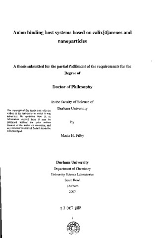 A range of novel host molecules with various degrees of pre-organisation for the supramolecular complexation of anionic guest species have been synthesized. Both organic core and nanoparticle-based derivatives of the ligands have been prepared and the properties of the new host ligands studied with particular reference to their anion binding behaviour. Two types of calix[4]arene derived cationic hosts for anions with, respectively, 1,3-altemate and cone conformations have been prepared. The affinity of the tetrasubstituted calix[4]arene hosts for a variety of anions has been probed with Ή NMR spectroscopic titration. The ԼՅ-alternate system binds dicarboxylate anions in a ditopic manner while the cone compounds have the highest affinity for bromide anion and are deprotonated by carboxylates. The potentially fluorescent 1,3-altemate calix[4]arene that contains a pyridinium functionality coupled via a methylene spacer to a pyrene group undergoes selective chloride-induced conformational change which results in strong increase in both monomer and excimer emission. Gold nanoparticles protected with 5-[l ,2]dithiolan-3yl-pentanoic acid pyridin-3-ylamide remain stable as colloidal solution in methanol and the UV aborption spectra demonstrate the nanoparticles' response to exposure of a variety of anions by red shift with concomitant decrease in intensity. Titration of the colloidal solution with silver tetrafluoroborate results in an increase in absorption indicating possible interaction of silver cations with the pyridyl nitrogen atoms