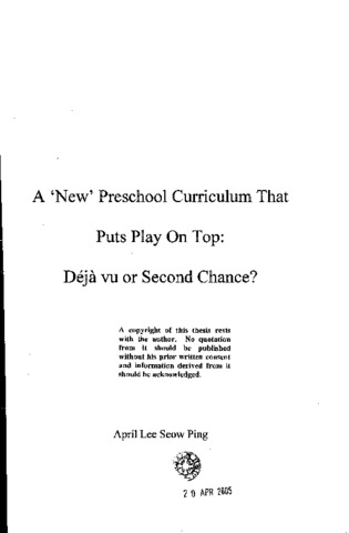 This thesis examines explanatory theories of play and an empirical study of preschoolers' play. It aims to provide an understanding of the educational purpose, value and extent of play in children’s lives. Understanding the interrelationship between play, development and learning, the writer hopes to be better equipped to facilitate and organize a meaningful play environment during the preschool years of young children to guide them into realising their potential of becoming confident and communicative beings; never mind the neat handwriting or colouring that preschool education focuses so much upon in Singapore. Considering explanations, the dominant theories of Piaget and Vygotsky's ideas in the play field are discussed. A framework towards an integrated perspective of a play- centred curriculum is presented. Considering evidence, studies of children’s play development in the domains of cognitive, language, social and emotional development are reviewed and summarized. Propelled earlier in the year 2003 by the Ministry of Education, Singapore, to accord play at the top of a new preschool curriculum, a battery of simple play experiments and tests were carried out to establish the interdependence of play, learning and development of preschoolers. Answers to two research questions regarding play in the local preschool context were processed: (1) does thematic fantasy play training conducted during English Language Arts lessons increase preschoolers' incidences of fantasy play during free play periods? (2) Will thematic fantasy play training improve preschoolers' perspective- taking ability in the domains of cognition, perception and affection? The findings (N= 28) are presented. Their implications for Singapore preschool teacher training in a play- centred curriculum are discussed. The thesis concludes with a reconciliation of understanding amongst all the high- stakes players of preschool education: parents of preschool children, preschool teachers and of course, the preschoolers themselves. The ultimate purpose of this thesis is to lay out and execute a local yet truly new preschool curriculum that puts Play at the top.