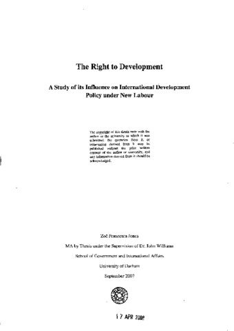 This thesis will examine how the emerging concept of the right to development in international human rights has influenced the policy and practice of New Labour with regards to their international development work. It will focus on some of the main aspects which the right to development incorporates, such as partnerships and participation, and will examine how these principles have been established in the work of DFID. Its aim is to assess whether the changes in recent development policy and practice, under New Labour, have been the result of the creation of a right to development, or whether the corresponding changes in theory and practice can be attributed to other factors. It will explore the existing literature on the right to development, the historical changes in British development policy, the incorporation of participatory and partnership methods into the work of DFID, and the relationship between security and the right to development. The thesis will conclude with an assessment of the extent to which the changes in policy and practice under New Labour can be attributed to the emerging concept of aright to development, and its corresponding codification in the United Nations Declaration on the Right to Development, and offer suggestions of the effect that these findings may have on the concept.
