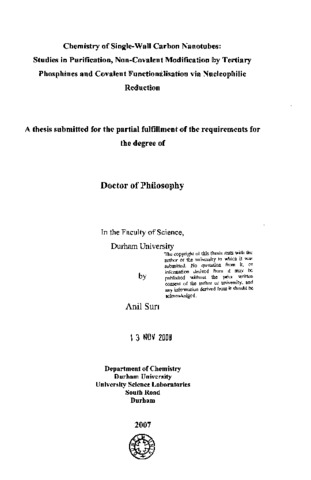 Chemistry of single-wall Carbon Nanotubes: Studies in purification, non-covalent modifîcation by tertiary phosphines and covalent functionalisation via Nucleophilic reduction