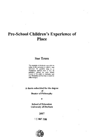 The experience of place has been the subject of attention by researchers from a variety of disciplines. However, despite a growing interest in the geographies of children there have been very few empirical studies investigating pre-school children’s experience of place. To address this issue, this thesis seeks to gather understandings of this phenomenon that may inform educational research. This study investigates the individual experiences of place of 12 pre-school children in 3 locations - Durham City, England; Drumlithie a village in Aberdeenshire, Scotland, and Fraserburgh a town also in Aberdeenshire. The empirical work is set within an interpretive approach that is sensitive to the competencies of the children and which is in line with the author's philosophical assumptions. The strategies employed to generate data include an affective activity, research conversations, walking expeditions with cameras, semi-structured interviews and artwork. The theoretical framework for this research is based on an extensive inter-disciplinary review of the literature and is informed by ecological and developmental psychology theories and recent concepts of childhood. It assumes a holistic approach to understanding the complex, multifaceted concept of place as experienced by pre-school children who are themselves viewed as active learners and experts in their own lives. The analysis suggests that the pre-school children in this research experience place on highly personal and individual bases. It appears that the children employ the strategy of breaking a place down into component parts and use these components to structure their understandings. A tentative model is devised to show the workings of this process. The implications of the findings are discussed in relation to current understandings of pre-school children's learning, and suggestions are made for further research.