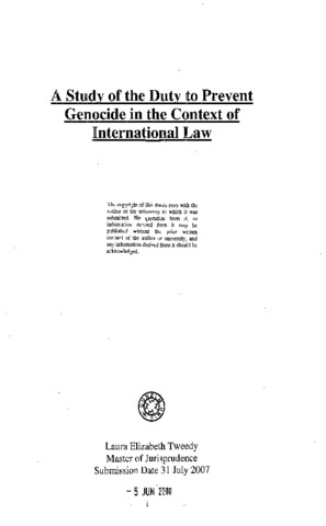 This thesis will attempt to uncover what the law surrounding the prevention of genocide amounts to. The provisions of Genocide Convention and duties under customary law will be examined in detail. It will be argued that the law to prevent genocide only requires a territorial basis of jurisdiction, but this does envelop some practical means of domestic prevention, as well as criminal law and civil law elements. Although beneficial, universal jurisdiction does not exist for the crime of genocide. States do however have the opportunity to take action to prevent genocide in other countries, but that is only if the offending State allows for it or non military action is invoked. Early warning systems and State monitoring may be the best means to prevent genocide. Forcible action may also be taken, but only with Security Council authorisation. The United Nations is in a favourable position to help prevent genocide and it has the option, but again no duty, to do so. Resolutions, peace keeping forces and diplomatic measures are effective means which can be employed by the Untied Nations to prevent genocide. These measures for prevention will then be examined in relation to the current situation in Darfur as well as determining whether there is sufficient evidence to assert that genocide is occurring there.