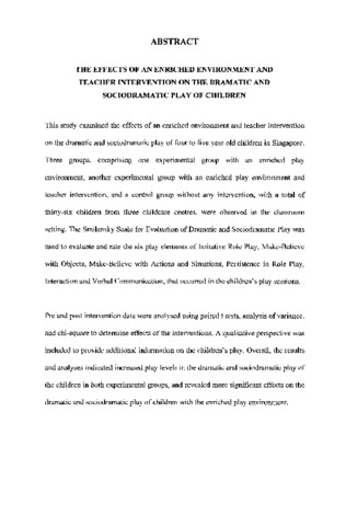 This study examined the effects of an enriched environment and teacher intervention on the dramatic and sociodramatic play of four to five year old children in Singapore. Three groups, comprising one experimental group with an enriched play environment, another experimental group with an enriched play environment and teacher intervention, and a control group without any intervention, with a total of thirty-six children from three childcare centres, were observed in the classroom setting. The Smilansky Scale for Evaluation of Dramatic and Sociodramatic Play was used to evaluate and rate the six play elements of Imitative Role Play, Make-Believe with Objects, Make-Believe with Actions and Situations, Persistence in Role Play, Interaction and Verbal Communication, that occurred in the children's play sessions. Pre and post intervention data were analysed using paired t tests, analysis of variance, and chi-square to determine effects of the interventions. A qualitative perspective was included to provide additional information on the children's play. Overall, the results and analyses indicated increased play levels in the dramatic and sociodramatic play of the children in both experimental groups, and revealed more significant effects on the dramatic and sociodramatic play of children with the enriched play environment. Research has supported the influence of the enriched play environment (Petrakos and Howe, 1996), and the effects of the enriched play environment and teacher intervention (Smilansky, 1968) in children's play. The findings of this study serve to highlight the effects of the enriched environment and teacher intervention in enhancing the dramatic and sociodramatic play of children. The need to evaluate the role of teachers in children's play is also highlighted, with implications for teacher training programmes in the local context to emphasise the values and understanding of play in relation to learning experiences for children and the preschool curriculum.