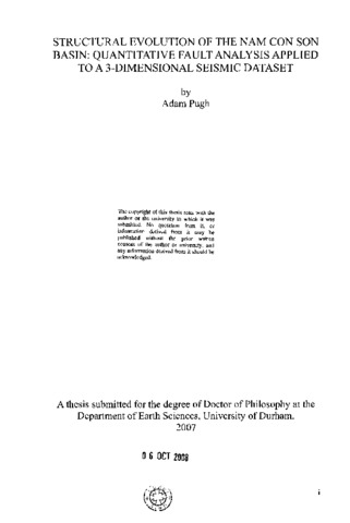 The Nam Con Son Basin is one of several Tertiary rift basins located on the continental shelf, offshore Indochina. It has received relatively little attention until recently and remains a poorly understood sedimentary basin. The discovery and production of significant volumes of hydrocarbons from within fault-bounded structural highs has spurred a drive to better understand the basin structure. Previous interpretations of regional 2-dimensional seismic data suggested a complex structure, with E-W trending Eocene-Oligocene faults, overprinted by a rhomboidal pattern of mainly N-S and NE- SW trending Miocene faults and the possible involvement of compressional and/or strike-slip tectonics. The driving mechanism for extension on the continental shelf is not fully understood, but the Cenozoic structural evolution was undoubtedly influenced by a heterogeneous crust cut by a number of pre-existing Palaeozoic and Mesozoic structures. Crucially, the western extent of South China Sea rifting in the region may have been controlled by the -N-S trending edge of the Indochina craton, a major rheological boundary that likely underlies the Nam Con Son Basin. In addition to its economic importance, the proximity of the basin to the tip of the South China Sea, the possible involvement of wrench tectonics and the potential influence of pre-existing fabrics, makes it an ideal target for academic study. A 3-dimensional seismic dataset from the centre of the Basin has been used to build a fault/horizon model of the Early-Middle Miocene syn-rift sequence. The faults have a wide range of orientations and, in all cases, the hanging wall is down-thrown consistent with apparent normal offsets; there is no evidence for strike-slip or reverse faulting. By accurately modelling the fault surfaces and the fault/horizon intersections, the dip, strike, dip-azimuth and offset of 225 faults have been calculated and used to quantitatively analyse the fault sample. The timing of fault activity has been constrained for each fault and shows that all the faults are broadly contemporary but that the number of active faults increased through time. This is partly attributed to continuing subsidence on graben bounding faults" which focussed faulting and extension within the graben. There is no correlation between fault strike and fault age and the faults show no significant rotation about vertical axes with progressive deformation. The range of fault orientations likely reflects the conflicting influences of the -NW-SE regional extension direction and the dominant -N-S trending basement fabric. A systematic variation in maximum dip-slip fault offset (defined as the distance between the footwall and hangingwall cutoffs measured parallel to the fault surface) with fault strike has revealed an 'ideal' fault orientation, which can be used to infer the direction of maximum horizontal extension. The relationship between this extension direction, the dominant pre-existing basement fabric and the regional displacement direction is consistent with a model of moderately extension-dominated dextral transtension for the Nam Con Son Basin synchronous with the opening of the South China Sea. At a local scale, the influence of the underlying Eocene-Oligocene structures has produced offset depocentres, along strike fault polarity flips, and complex accommodation zones.