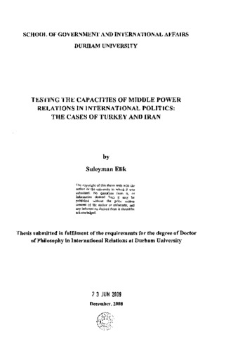 The aim of this study is to provide a fresh analysis of middle-power states' capabilities within the international political arena, utilising an integrated experimental model to conduct a unit-level of analysis of Turko-Iraman relations with a focus on economic, diplomatic, political and military issues. The principal argument of this study is that the middle-power state is the key actor in the region, socially constructed within a distinctive political context; resisting super power hegemonic intervention, and having bargaining power with regard to more powerful entities. The socially constructed identities of Turkey and Iran are highlighted as key influences in foreign relations, leading to a complex dynamic between these 'reluctant neighbours.' The limits of their power are clarified as consisting of employing agent groups to manipulate internal threats and apply counter-terrorist/revolutionary politics, but falling short of sufficient to control transnational nationalism. Using this ethnic political card to negate each other's influence invites foreign power penetration into regional politics. Kurdish nationalism acts as an independent regional player and challenges the Turkish and Iranian political identities, both secularist and religious. Turkey and Iran endavour to apply the 'niche diplomacy' in energy and pipeline routes competition in the Southern Caucasus. The study, thus, examines the competing factors of the both countries' geographic adjacency as a stimulus for economic integration as a partial entrenchment against diplomatic mistrust, and preventing systematic regional integration within the last three decades within the Economic Cooperation Organisation (ECO) framework. The role of Iran's nuclear ambitions and Turkey's western alliances are examined as influences on the countries' identities. Contrary to the systemic and regional circumstances of secularist Turkey, the messianic identity of Iranian religious nationalism has resulted in a nuclear weaponisation programme that not only militarises the domestic politics of Iran, but also undermines the countries' mutual trust, with a profound adverse effect on the countries' economic relationship. In order to increase the efficiency and explanatory power of middle-power state, this study amended the middle-power state theory, and successfully tested its applicability to Turkish-Iranian relationship through various variables related to international relations, international policy aspects of domestic political events, ethnic tension and economic relations.