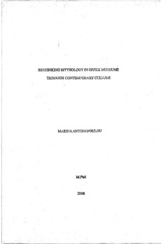This thesis investigates the character with which Greek mythology, one of the most durable manifestations of ancient Greek heritage, survives in the perception of contemporary Greeks, and the role that Greek museums do and could play in this. The starting point for this investigation is the appraisal of Greek mythology as an ideological creation of ancient Greece that bears pan-human and diachronie intellectual and cultural potency and, as such, constitutes a significant interpretative tool for the contemporary Greek individual. More specifically, this thesis reconsiders the relationships between Greek mythology, Greek museums and Greek people, using as a bridge contemporary Greek art. It does so in three main chapters, which investigate and analyze different parameters of this nexus of relationships. Greek mythology’s adaptations by contemporary Greek society are also explored in an attempt to establish the dominant contemporary meanings of Greek mythology. Then, the relation of a specific cultural manifestation of contemporary Greek society, that of contemporary art, to Greek mythology is extensively analyzed through a series of interviews that were conducted exclusively for this thesis. In these interviews, contemporary Greek musicians, authors and visual artists speak of the position that Greek mythology possess (or does not possess) in their artistic expression, and discuss the intellectual and cultural significance that Greek myths retain for contemporary society and people. From these investigations, two antithetic poles emerge. On the one hand, there is the trivializing way in which Greek society deals with its myths through their exploitation, for example, for commercial or nationalist purposes. On the other hand, there is the sensitivity with which my interviewees pored over Greek myths, enabling them to emerge full of dynamism, and illuminating them as ever-active negotiators of life and human nature. Thus, contemporary art is identified as a powerful conveyor of mythology’s potency for the contemporary individual. Next, the position of Greek archaeological museums, as major official institutions that do, or could, represent and safeguard Greek mythology is explored and critically assessed. It emerges that Greek museums are rather unconcerned with Greek mythology’s representation and communication and thus, confirm that Greek mythology is a dead and irrelevant representative of a glorious, yet remote and strange, ancient civilization.