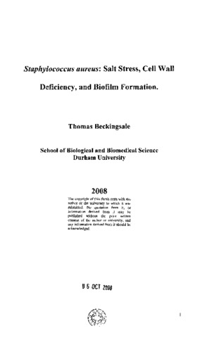 Staphylococcus aureus (S. aureus) is a major cause of chronic infection and is of particular concern in the infection of implanted prostheses. Biofilm formation offers bacteria innate protection from antimicrobial agents and prevents the eradication of prosthetic infection in vivo. Current work shows a positive correlation between salt (NaCI) stress and cell wall deficiency in S. aureus. Cell wall deficient cells, produced in response to salt stress, demonstrate an increase in penicillin G resistance which increases with further salt stress, but returns to baseline levels after removal of the salt stress, indicating a phenotypic change in response to salt stress. Lysostaphin susceptibility decreases after salt stress, indicating changes to the structure of the cell wall in response to salt stress. Biofilm assays also show a positive correlation between biofilm formation and increased NaCI concentration. Further investigation using other Group I metals showed a positive correlation between increasing levels of KCl concentration and biofilm formation. This appears to be an ion specific effect related to potassium and sodium, as other Group I metals (Lithium, Rubidium and Caesium) did not have a similar effect. RT-PCR showed that both KCl and NaCI stress lead to a decrease in transcription of several genes, including some involved in cell wall synthesis, global gene regulation and polysaccharide intercellular adhesin production, over the baseline level. However, RT-PCR shows no significant difference between cells stressed with either KCl or NaCI. The work in this thesis shows a positive link between cell wall deficiency, antibiotic resistance and biofilm formation in S. aureus cells stressed with NaCI or KCl.