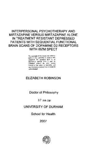 Interpersonal psychotherapy and mirtazapine versus mirtazapine alone in treatment resistant depressed patients with sequential functional brain scans of dopamine D2 receptors with IBZM spect
