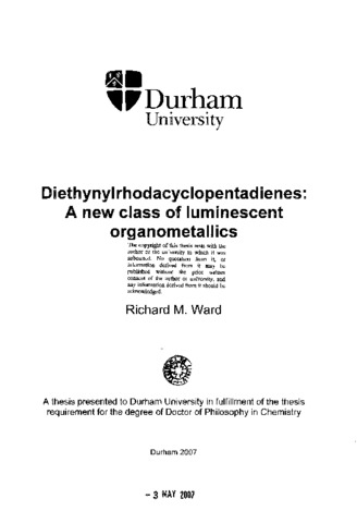 A series of mer,cis-[tris(trimethylphosphine)-X-2,5-bis(4-R-phenylethynyl)-3,4- bis(4-R-phenyl)rhodacyclopenta-2,4-diene] compounds have been synthesised by the regiospecific reductive coupling of 1,4-bis(4-R-phenyl)buta-1,3-diynes with КҺ(РМe(_3))(_4)Х (where X = -C≡С –TMS, -С≡С(_6)Н(_4)-4-ММe(_2), -С≡С-С≡С-С(_6)Н(_4)-4-МРһ(_2), and R = H, Me, ОМе, SMe, СF(_3), CN, СО(_2)Ме, NMe(_2), NO(_2), C≡C-TMS). The compounds absorb strongly in the range 453-544 nm, and are photoluminescent, in solution at room temperature, emitting in the range 496-631 nm with singlet lifetimes and quantum yields of 3-18 %. The photophysical properties are strongly influenced by the nature of R, but appear to be almost independent of the acetylide used; the latter is related to unfavourable steric interactions. Acceptor R groups red-shift both absorption and emission much more significantly than donor groups. A number of the structures have been solved by single crystal X-ray diffraction and the structures are compared and contrasted. Analogous compounds with X = Me and СІ have also been prepared. The absorbance properties are similar to the acetylide-substituted derivatives, although absorption maxima are slightly shifted to lower energy. Also correlated with this are the values of J(_Rh-P) for the sets of compounds which surprisingly suggest better donating ability of both Me and СІ over the acetylides. The СІ compound is luminescent, its emission maximum again shifted to lower energy from that of the acetylide examples. In stark contrast to the acetylide and СІ rhodacycle derivatives, the Me compounds are not emissive at room temperature in solution. The rhodacycles react slowly, with additional diyne only under forcing conditions, to form highly substituted benzenes. It is shown that the rhodacycles can catalyse the regiospecific cyclotrimerisation of 1,4-bis(4-R-phenyl)buta-1,3-diynes to give l,2,4-tris(4- R-phenylethynyl)-2,5,6-tri(4-R-phenyl)benzenes exclusively. The activity of the rhodacycles as catalysts for trimerisation are low, but due to the 2,5- selectivity of the rhodacycle formation, the reaction is regiospecific. The cyclotrimers are luminescent and the photophysical properties have been studied. The single-crystal X-ray structure for the parent cyclotrimer, l,2,4-tris(phenylethynyl)-2,5,6-tri(phenyl)benzene, has been obtained and is discussed. The mechanism for rhodacycle formation has been probed. A number of Rh-diyne π-complexes, in which one of the diyne C≡C bonds is coordinated to Rh, which were observed as intermediates during rhodacycle syntheses, have been isolated and characterised. 1H, (^19) F and (^31) P