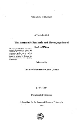As research into the interactions and reactivity of RNA species often requires the bioconjugation of reporter or substrate compounds to the oligonucleotide with high regiospecificity, we envisage uses for RNA molecules modified to incorporate reactive aza groups at the 5'-terminus. By incorporating groups with novel reactivity at specific locations within the RNA molecule, 'handles' are provided to facilitate the specific bioconjugation of the RNA to a wide range of compounds. We achieved the modification through the use guanosine derivatives, modified to feature 5’-aza groups, as initiators in the T7 RNA polymerase mediated synthesis of RNA. The figure above shows the structures of the three initiator species used in our research. The synthesis of GANP from Amino-G was achieved via the development of a regiospecific amino-phosphorylation reaction, which takes place in aqueous solution and yields the potentially hydrolytically unstable GANP in high yield (90 %).Through the use of Amino-G and GANP we were able to improve on literature methods for the synthesis of 5'-AminoRNA, raising the observed level of incorporation from 20 % to a maximum of 88 %(^45). The use of Azido-G enabled us to achieve the unprecedented direct incorporation of an azide group into the 5'-terminus of RNA species (37 %). We successfully demonstrated that the azide group could be reduced to give 5'-AminoRNA or used directly in a copper mediated bioconjugation reaction.