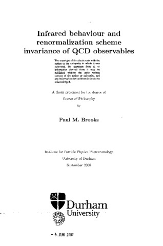 In this thesis we study the infrared (IR) behaviour of QCD observables, and solutions to the problem of renormalization scheme dependence. We investigate the IR behaviour of all-orders leading-b renormalon resummations for certain Euclidean observables (the Adler-D function and the GLS and Björken sum rules) in the Borei representation. We find that these resummations are finite at the Landau pole (Q(^2) =Λ(^2)) and also 'freeze’ to zero in the Q(^2)→ 0 limit. We find this finite Landau pole behaviour has its origin in curious relations between IR and UV renormalons, which correspond to deeper conformal symmetries in QCD Green's functions. We consider these Borei resumed results in a skeleton expansion representation. This representation leads naturally to the standard Borei representation in the UV(Q(^2) ˃Λ(^2)) region and to a modified Borei representation in the IR (Q(^2) ˂Λ(^2)) region. We also consider the ambiguous part of the perturbative expansion in these representations. By demanding that such ambiguities cancel with similar ambiguities generated by the non-perturbative OPE, we are led to a new model for power corrections. We apply the complete renormalization group improved (CORGI) approach to all-orders renormalon resummations of the above-mentioned sum rules and compare the resultant predictions with experimental data. We also test our model for power corrections on these observables and find that the data favours power corrections of reasonably small magnitude. We also apply the CORGI approach, together with the physical scale and the effective charge approaches, to moments of F^^ and Բշ^. We use the Bernstein averages method in which any dependence of the analysis on regions of X and Q2 inaccessible to experiment is reduced.
