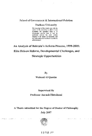 An analysis of Bahrain's reform process, 1999-2005: Elite driven reform, developmental challenges, and strategic opportunities