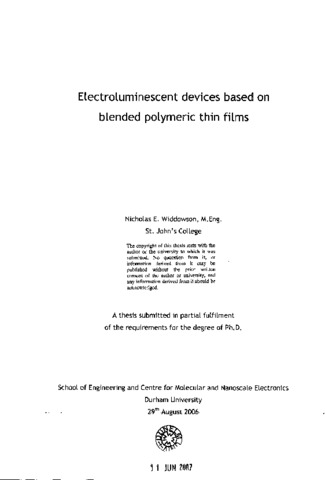 This thesis is concerned with the characteristics of organic light-emitting devices based on the polymer poly(2֊methoxy֊5-(5'-ethyIhexyloxy)֊p֊phenylenevinylene) (MEH-PPV).The emissive layer of each device was formed either from pure MEH-PPV or from a blend of MEH-PPV with an electron-transporting small molecule material. A film of either indium tin oxide (ITO) or aluminium-doped zinc oxide (AZO) on glass was used to provide a transparent anode. The pure or blended emissive material was spin-coated from solution onto the anode. Calcium or aluminium cathodes were deposited by thermal evaporation onto the emissive film. The cutrent-voltage, light-voltage, quantum efficiency and stability characteristics of the devices were obtained using purpose-designed measurement equipment. These characteristics were influenced, amongst other factors, by the blend composition. The devices with an aluminium cathode and an emissive layer formed from 50 % MEH-PPV and 50 % PDPyDP had among the best characteristics. Compared with the equivalent unblended devices they averaged 40 times greater light emission, 35 times higher efficiency, and they emitted light for more than 18 days in place of tens of minutes. The half life of the most stable devices was 63 һ which, though much less than the tens of thousands of hours claimed by commercial developers, represents an increase of 30 times that of an unblended device. The increased light emission and quantum efficiency data resulted from the enhanced earner injection and transport provided by the electron transport material. It is suggested that the increased stability was caused by the small molecule material performing the role of a nano-encapsulation around each polymer chain. That is to say, the data suggest that each polymer chain was individually protected from the effects of contaminants such as oxygen and water vapour by the small molecule within the film .The choice of anode material also affected the rate of degradation. The surface morphology of the anode material of devices which had previously been operated for extended periods were analysed using an AFM. Electromigration of ITO anodes to form sharp spikes was not uncommon, particularly in devices with short lifetimes. As-deposited AΖO generally had a smoother morphology than as-deposited ITO. Following device operation fewer electromigtation spikes were observed in AZO than ITO.