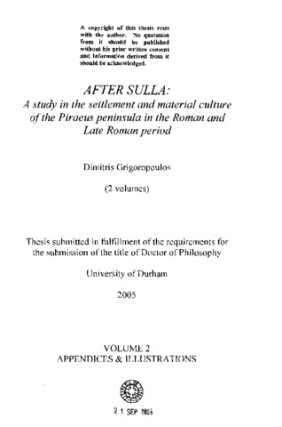 After Sulla: study in the settlement and material culture of the Piraeus peninsula in the Roman and Late Roman period