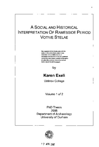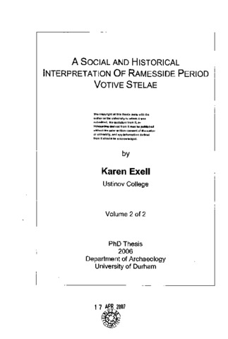The following thesis analyses a dataset of 436 Egyptian votive stelae dating to the Ramesside period (1295-1069 ВСЕ), from six sites: Deir el Medina at Thebes (264 stelae), non-Deir el Medina stelae (55) from the Theban area, Abu Simbel (21 stelae) and Wadi es-Sebua (15 stelae) in Lower Nubia, Qantir/Pi-Ramesses in the eastern Delta (74 stelae) and Zawiyet Umm el-Rakham (7 stelae) in the Libyan desert. The stelae were drawn from published catalogues of museum collections, excavation reports, individual publications, and photographs supplied by institutions and researchers where no published image existed. The thesis presents the votive stelae as the end result of defined social practices, exploring the role of votive stelae as social artifacts which, through image, text and materiality, are active agents in transmitting information on individual and group social status and identity, normative social structure, and alternate social organisation. The stelae are analysed according to the iconographie content, status- or function-related information (title and/or clothing of the dedicator), and original location, or context, of the stela. These elements are understood to provide information on the social context for the utilisation of stelae in Ramesside Egypt. Central to the thesis is a reading of the representations as coded references to actual events, or practices. The examination requires an analysis of the social and representational conventions within which the stelae and their representations were created. The methodology is initially tested against the core dataset of Deir el Medina stelae, followed by a comparative analysis of the non-Deir el Medina stelae from Thebes, and the remaining four geographically distant sites. The thesis reveals the form, use and production of votive stelae are related to royal activity and sanctions, and promulgate the shifting central ideology and structure. The votive stelae can also, when the iconography is decoded, be linked to specific events, illuminating the local social milieu of the communities studied, and their internal social organisation.