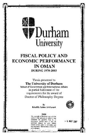 The state's calculated intervention in the economy is an issue accepted by researchers. To fulfil the overall goals of the economy and to achieve its full potential, the state has to involve itself in the economics of production and distribution throughout the nation. Within this framework, the state national budget emerges as an essential method in the fiscal planning's implementation process. Thus, the economic policies' goals should comply with the goals of ûie economic plans. The Sultanate of Oman has adopted the economic planning approach since 1976, when successive five-year plans began. Since that time, a high level of investment in infrastructure and social services has been achieved. Nonetheless, by having a look at the economic indicators in the overall economy and in particular sectors, a significant conclusion can be drawn; that those indicators do not reflect the ambitious objectives outlined in the original development plans. As fiscal policies are on the top of the economic policies and methods, which some researchers hold responsible for economic success and failure, the main goal of this study is to investigate to what extent the fiscal policies in the Sultanate of Oman could play a positive role in accomplishing the developmental targets. To achieve the goals of the study, both quantitative and qualitative methods are utilized. Assessment and evaluation are used as secondary approaches and employ modem econometrics approaches as well as diagrammatic and tabular data representations. Examining the currently adopted fiscal policies in three areas, taxation, expenditure, and policies dealing with planned budgetary deficit and public debt and employing OLS, ECM methods, the most important findings show a wide gap between actual and potential tax revenues; tax rates positively relate to FDI inflows suggesting that foreign investors do not necessarily respond to tax incentives and that other determinants lie behind the deterioration of FDI inflows; government investment expenditure can be associated with lower growth; a crowding-out phenomenon exists between public investment and private investment indicating that the government investment in projects acting as a substitute for private investment; there is a negative link between foreign debt and growth; finally, the fiscal deficit is influencing the stance of the balance of payments negatively. Moreover, to inspect whether a fiscal policy aiming at rationalizing government expenditure in the Sultanate of Oman's economy may diminish the growth of output; in other words, to check whether the disaggregated government expenditures Granger-cause output or vice versa, the contemporaneous relationship between disaggregated public expenditure and GDP/GNP was examined. The study deployed the Johansen cointegration test, the standard Granger causality test and the Granger causality test in the context of an ECM, to determine the long-run relationship as well as the directions and patterns of causality between the disaggregated public expenditure and GDP/GNP. Neither the empirical results obtained sustain the Wagnerian law which states that economic growth causes the growth of government expenditure, nor was it possible to conclude in the favour of the opposing Keynesian hypothesis. Thus, the results do not support the argument that changes in government expenditure tend to accelerate or slow GDP/GNP growth" suggesting a proposition that a shrinking in government expenditure, as a strategy to control the fiscal imbalances in the Omani economy, could be adopted.