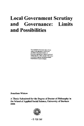 The central focus of this thesis is the role of scrutiny within the modernised system of local government and governance. The study was carried out from an insider-research perspective within the scrutiny team of a unitary authority. The scrutiny process provided a 'window' through which to analyse the development, and application, of New Labour's local government modernisation agenda. The thesis contains a critical examination of literature about the modernisation of local government and, in particular, the roles of the scrutiny function. This discussion is located within broader literatures about governance and the changing role of local government. It is argued that, while there is scope for manoeuvre at both national and local levels, global trends have provided powerful drivers for policy development and the subsequent fragmentation of the nation state. Empirical data were obtained through case studies of four scrutiny inquiries, selected to permit an exploration of limitations and possibilities of local government scrutiny within this context of globalisation and the shift from government to governance. An analysis of the case studies highlighted the importance of four factors in explaining variations in governance outcomes; risk to legitimacy, public/pressure group engagement, regulation/hierarchy and certainty/agreement. In light of these findings it is concluded scrutiny is an imperfect tool within an imperfect (governance) system. However, the local government modernisation agenda had created a number of new opportunities for local government, and scrutiny, to function more effectively in the current governance context.