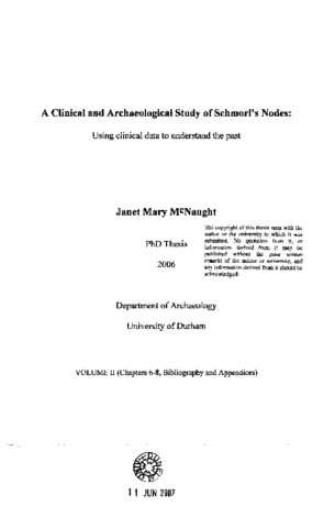 This study of Schmorl 's nodes in British populations past and present attempts to reach a better understanding of the origins and aetiology of Schmorl' s nodes and their impact upon the vertebral column in relation to age, sex, pre-existing skeletal lower limb asymmetry, and work patterns. Georg Schmorl has been accepted as the leading authority on the nodes he named. Eighty years later modem diagnostic radiographic imaging and macroscopic studies are used to reach informed answers to the questions of prevalence, relationship to other degenerative joint diseases of the spine, and the possibility of Schmorl's node recognition by clinicians when presented with specific pain location. The clinical samples studied were from Pinderfields Hospital, Wakefield, and the Royal Hospital for Sick Children, Edinburgh. The archaeological samples studied were from Captain's Cabin, Dunbar, The Hirsel, Coldstream and Whithom Priory, Galloway, all in Scotland, and St. Andrew, Fishergate, York, and Tanners Row, Pontefract in England, and dated to between the 6th and 16th centuries AD. The archaeological samples were from military and monastic settlements in urban and rural contexts. Congenital disorders and acute trauma affecting the spine, and alterations to the normal primary and secondary vertebral curves were studied in an attempt to prove or disprove a relationship to Schmorl's nodes. Macroscopic study of the vertebral columns from the archaeological samples, and radiographs of the clinical samples, were analysed, along with clinical case histories and known background information of the demography, settlement type and, the geographic and topographic locations for each sample. No weak area was found in the vertebral end plate. Positive proof for symptomatic Schmorl's nodes was found in the clinical samples. The greatest numbers of Schmorl' s nodes were not formed in the first two decades of life, but in the third and fourth decades. Scheuermann's disease may be indirectly attributable to subadult Schmorl's nodes. However, Schmorl's nodes may or may not precede scoliosis. Males and females Of similar ages from the same settlements did not produce. Similar frequencies, nor were similar patterns observed between samples. Further studies using larger and better-preserved samples, with good contextual evidence may help to provide clearer positive or, negative evidence for work related Schmorl's nodes.