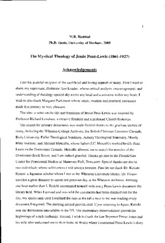 This thesis examines the life and mystical theology of Jessie Penn-Lewis (1861-1927). While Penn-Lewis has been the subject of historical research, particularly by scholars of the evangelical movement of the late 19'h century, yet her theology has not received adequate assessment from the academic community. Therefore, this thesis undertakes an analysis of the mystical theology of Jessie Penn-Lewis whereby I demonstrate that Penn- Lewis was part of the classical mystical tradition, over and against the Quietism operative within the Keswick Conventions of her day. Following a brief summary of her life, international ministry, and mystical writings, I show that Penn-Lewis's mystical path engaged suffering in the soul's ascent to union with the Divine and this separated her from the Quietists who insisted upon the one-act of passivity in reaching the highest mystical states. I trace the Quietism within the early Keswick Conventions to a mishandling of the Prayer of Simple Regard by Quietists such as Madame Guyon and Thomas Upham. Upham's reshaping of Guyon's Quietism was readily assimilated by leaders within the early Keswick Conventions, excluding Mrs. Jessie Penn-Lewis who could not tolerate the passivity and absorption of the will demanded by Quietism. Penn- Lewis's mystical theology, also called Cross Theology, was nurtured by the Romantic mood of the day, and was thus rooted in personal religious experiences, including the experience of suffering. In this way Cross Theology combines the apophatic tradition of Bonaventure with an experience of suffering, in the soul's ascent, such that Cross Theology opposes the shallow mysticism of Keswick's Quietists who rejected effort and suffering in the path toward the unitive state. Penn-Lewis'ร mysticism also advances and the social ramifications of women's union with Christ. According to Penn-Lewis, women who are united with Christ bear the fruits and responsibilities of the highest mystical state, just as men. Cross Theology therefore had social consequences manifest in women’s equal service beside men in Christian work. Penn-Lewis's mysticism was central to her ministry, her interpretation of scripture and her activism on behalf of women. Thus, Penn-Lewis was a Protestant mystic whose mysticism gave shape to an egalitarian agenda that challenged the gender bias of the Church at the turn of the century.