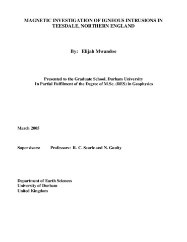 A total field magnetic survey was conducted in Harwood valley in Northern Teesdale, and the neighbouring area, to investigate the igneous intrusions which could be the cause of a magnetic anomaly and metasomatism in the mineralization of the area. Niccolite and other nickel-bearing minerals had been found in magnetite-rich ore at three localities in Harwood valley by a team of the British Geological Survey. This mineral assemblage has only been sighted in a few other zones and the cause of mineralization was assumed to be metamorphism due to the emplacement of the Whin Sill and associated dykes during the late Carboniferous-early Permian age. Magnetic profiles recently acquired in the area confirm the existence of a dyke intruding the Teesdale fault along the Harwood valley. The average amplitude of the anomaly is 350nT, reversed with respect to the present field. Further investigations to the south-east and north-west of the valley relate the intrusion with the known outcrops of the Cleveland dyke (Tertiary). An outcrop of an igneous intrusion that bears similar properties with samples of the Cleveland dyke rock was recently sighted by the author at lower Langdon Beck near the confluence of the Tees and Harwood rivers. Thin sections of this rock displayed an identical match in grain size and pigment composition with the Cleveland dyke samples from other known outcrops, confirming the dyke's presence along the Teesdale Fault.2.5D modelling of the magnetic profiles was carried out and the results reflect the depth to the top of the dyke at Harwood to be about 30m. Thickness of the body varies from 5 to 25m but is 12m at Harwood and about 14m in Etters Gill. Further south of the valley at Langdon Beck is another geological formation; the Burtreeford Disturbance. This is a series of faulting and folding that was a result of compressional stress (Permian age) from a WSW direction. It also produced the E- facing monoclinal folds of the Dent Fault zone and the easterly directed Pennine thrusts of the Cross Fell Inlier before, during and after the emplacement of the Whin. The study here reflects the Disturbance as a magnetic high and its confluence with the Teesdale fault, the inferred Cleveland dyke and the Whin Sill offers a complex interpretation challenge. A GIS data base for the project area was created using Arc-GIS, GRAVMAG, SURFER,DIDGER and other Microsoft Office applications. General interpretation of the anomalies is conducted but conclusions raise several questions. The cause of the mineralization in Harwood Valley is still uncertain, though it could be due to the cooling Cleveland dyke (58Ma) or the dyke could be forming a passage for the fluids of unknown age from the lower crust or mantle that cool and crystallize at shallower depths.