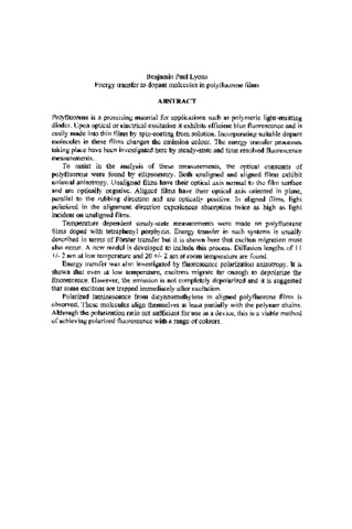Polyfluorene is a promising material for applications such as polymeric light-emitting diodes. Upon optical or electrical excitation it exhibits efficient blue fluorescence and is easily made into thin films by spin-coating from solution. Incorporating suitable dopant molecules in these films changes the emission colour. The energy transfer processes taking place have been investigated here by steady-state and time resolved fluorescence measurements. To assist in the analysis of these measurements, the optical constants of polyfluorene were found by ellipsometry. Both unaligned and aligned films exhibit uniaxial anisotropy. Unaligned films have their optical axis normal to the film surface and are optically negative. Aligned films have their optical axis oriented in plane, parallel to the rubbing direction and are optically positive. In aligned films, light polarized in the alignment direction experiences absorption twice as high as light incident on unaligned films. Temperature dependent steady-state measurements were made on polyfluorene films doped with tetraphenyl poiphyrin. Energy transfer in such systems is usually described in terms of Forster transfer but it is shown here that exciton migration must also occur. A new model is developed to include this process. Diffusion lengths of 11 +1- 2 nm at low temperature and 20 +/- 2 nm at room temperature are found. Energy transfer was also investigated by fluorescence polarization anisotropy. It is shown that even at low temperature; excitons migrate far enough to depolarize the fluorescence. However, the emission is not completely depolarized and it is suggested that some excitons are trapped immediately after excitation. Polarized luminescence from dicyanomethylene in aligned polyfluorene films is observed. These molecules align themselves at least partially with the polymer chains. Although the polarization ratio not sufficient for use in a device, this is a viable method of achieving polarized fluorescence with a range of colours.