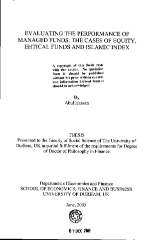 Managed funds have become a popular investment tool and possess a lot of advantages. However, in spite of their popularity, most past research findings on the evaluation of performance have suggested that managed funds were unable to do significantly better than a large unmanaged portfolio. The aim of this thesis is to evaluate empirically the performance of managed funds. The funds chosen are; UK equity, ethical unit trusts and US-based Dow Jones Islamic index -an index of Islamic ethical funds portfolio. We examine the performance of UK equity unit trusts which invest in UK equities, using monthly samples over the 1986 to 2001 time period. The study compares the return of these unit trusts with a three-factor model which takes into account their exposure to market, value and size risk. After controlling the risk factors, it is found that manager’s under-perfom the market. Contrary to the notion that small company shares offer abundant "beat the market" opportunities, we find that small company trusts are the worst performers. The performance persistence of unit trusts is also examined and it is found that good performance does not persist. There are investors who out of their concern regarding adverse changes in our environment, concerns for justice, and because of their opposition to the arms race, decline to purchase the securities of such enterprises that engage in what are termed unethical or socially irresponsible activities. Such activities usually include, but are not necessarily limited to, the production of armaments, alcohol and tobacco; engaging in activities that degrade the environment; and engaging in activities that treat people unfairly. Declining to invest in the securities of enterprises that engage in unethical practices is not only a form of social protest, but can also have the effect of diminishing the demand for a company's securities. A diminishment of demand may then have an adverse financial impact on a company. This may prove to be a crucial factor in influencing companies to change and become more socially responsible. The question therefore arises: has the investment performance o f ethical investors suffered in comparison to those who are not so responsible? To answer the above, a study has been done which encompasses 35 U K ethical unit trusts which cover the period of seven years tough 1996. The study presents a comprehensive evaluation o f managed funds performance by employing various single to multifactor benchmark models.The added value of introducing extra variables such as size, book to market, momentum and a bond index is explored by evaluating the performance using conditional information and comparing the investment performance of U K ethical unit trusts with unit trusts which are not ethical. After controlling for style tilts and allowing for time variation in betas and expected return, the results show that there is no significant difference in performance between U K ethical unit trust and their conventional peers. Within an unconditional setting SMB, HML and momentum factors are best able to explain ethical unit trust returns. Therefore, unconditional models perform much better than their conditional peers. Islamic ethical investors apply both Islamic ethical and financial criteria when evaluating investments in order to ensure that the securities selected are consistent with their value system and beliefs. Using monthly returns for the period starting from January 1996 to December 2003, the study is conducted to see the potential impact that Islamic ethical restrictions may have on investment performance by comparing the performance characteristics o f a diversified portfolio of Islamic screened stocks (Dow Jones Islamic index) w i t h conventional benchmark portfolio ( Dow Jones Index- Americas). Contrary to expectations, our findings indicate that application of Islamic ethical screens do not necessarily have an adverse impact on investment performance. Results actually show that expected returns of Islamic screened portfolios are higher than the expected returns o f conventional portfolios.