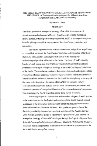 This thesis presents an evangelical theology of the child in the context of American evangelicalism and affluence. Employing an eclectic theological- critical method, a theological anthropology of the AAEC is developed through an interdisciplinary evangelical engagement of American history, sociology and economics. The central argument is that affluence constitutes a significant impediment to evangelical nurture of the AAEC in the 'discipline and instruction of the Lord' (Eph 6:4). Thus, nurture in evangelical affluence is the theological- anthropological problem addressed in the thesis. The issue of 'lack' raised by Matthew’s rich young man (Mt 19:20) provides the biblical-theological focal point for developing an evangelical theology of the AAEC in chapter 5, the heart of the thesis. The conclusion reached is that nurture in the cultural matrices of the evangelical affluence generated by technological consumer capitalism in the U.S. impedes spiritual and moral formation of the AAEC for discipleship in the way of the cross, risks disciplinary formation of the AAEC for capitalist culture, cultivates delusional belief that life consists in an abundance of possessions and hinders the practice of evangelical liberation of the poor on humanity's underside. This constitutes the AAEC's spiritual-moral 'lack' in late modernity. Following chapter 1’s introduction and overview, chapters 2 and 3 provide a diachronie lens for the theological anthropology of the AAEC through critical assessment of the theological anthropologies of the child in Jonathan Edwards, Horace Bushnell and Lawrence Richards. The synchronic perspective of the thesis is provided by chapter 4's evangelical sociology of the AAEC, drawing upon William Corsaro's theory of 'interpretive reproductions', and chapter 5's evangelical theology of the AAEC developed through theological critique of John Schneider's evangelical theology of affluence. Chapter 6, 'Whither the AAEC?', concludes with a recapitulation of the thesis and a forecast of possible futures for the AAEC in the twenty-first century.