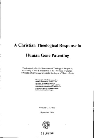The publication of the draft of the complete human genome is likely to prove to be one of the most significant breakthroughs for the medical sciences in this millennium because of the potential information it will yield. Patenting of human genetic material is permissible if these are can be shown to meet the four standard criteria applicable to all patents, which are that they are novel, involve an inventive step, are non-obvious and possess an industrial application. This dissertation addresses the main theological issue concerning patents, which is property as well as the ownership and use of such. It is argued that in the Bible, though a well-defined scriptural doctrine of property is absent, the right to property is tenable provided that it is in principle subordinate to the obligation to care for the weaker members of society. Property, in that regard, is to be used in fulfilment of the common good. I show that patenting human DNA can lead to injustice and therefore does not serve the common good. As this is contrary to the Christian theological understanding of the objective of property, I advocate that the correct response is to reject the practice. As a second line of argument, I also argue that because of its bi-elemental non-dual nature, human DNA is a metonymy for the human person since both possess a material and an immaterial component. These components are nonetheless inseparable without altering the overall nature of the DNA or the person. In this sense, human DNA is symbolic of the human person and on this account also should not be subjects of patents.