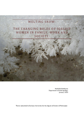 My thesis is a detailed anthropological study of the experiences of women as a result of their changing gender roles in Inuit families, in the labour market and in Inuit society more broadly. Although McElroy reported as early as 1975 that ‘a higher percentage of the total population of women than of men are employed [in Frobisher Bay and Pangnirtung]’ (McElroy 1975:679) the effects of this have never been systematically researched. This thesis is the first to use theoretical constructs from Bourdieu’s toolkit, including the capitals (social, cultural, symbolic), the habitus and the cultural arbitrary as well as theories of empowerment, to analyse how women have constructed and negotiated meaning in their new roles as financial provider for their families. It draws on data collected during ten months of fieldwork in Iqaluit, Canada, using a mix of qualitative methods including in-depth interviews, group discussions and participant observation. My findings show that different ideologies, values, ways of life and habitus shape and are shaped by life experiences of women in contemporary Iqaluit. These differences find their basis in women’s upbringing, ranging from traditional, to transitional, to contemporary; women’s experiences with education; and their interactions with incoming institutions with different cultural origins. Social negotiations characterise the process in which women create roles and identities for themselves, combining these different influences. Women’s access to financial and cultural capital in some cases impacts on and is a consequence of women’s empowerment, and their ability to challenge the cultural arbitrary. However, whilst empowerment is generally seen as a positive development, it can upset the balance between partners or other family members, who may struggle to appropriate economic, cultural and social change to the same extent. For that reason, it is important that the people of Nunavut, both men and women, work together to create for themselves a place in their family, community and society in which they can provide a meaningful contribution.