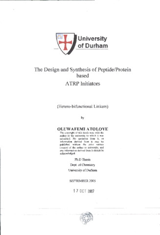 A series of novel hetero-bifunctional linkers functionalised as ATRP initiators and protein and peptide-reactive agents has been prepared using standard synthetic techniques. A protein-based initiator has been applied to the initiation of living polymerisation in the synthesis of a novel bioconjugate. The linkers were designed based on the properties of polyethylene glycol and short alkyl chains coupled to either amine selective or thiol selective moieties for chemoselectivity, and bromoisobutyryl esters to facilitate atom transfer living polymerisation. The bi-functional linkers have also been coupled to short peptides based on the RGD bio-recognition sequence synthesised by standard solid phase peptide synthesis and the protein. Human Serum Albumin (HSA) using standard conditions to prepare peptide/protein-based ATRP initiators. Attempts at functionalising peptides with the N succinimidyl 4-(2-bromo-2- methylpropionyloxy) butanoate linker were unsuccessful. Model test of the protein based ATRP initiators in living polymerisation towards a novel strategy for bioconjugate synthesis was inconclusive as premature termination of the polymer chain was observed by MALDI analysis.
