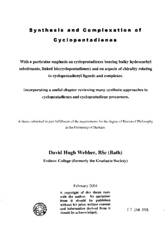 The first part of chapter 1 gives a short general introduction to the importance of cyclopentadienyl complexes. This leads on to a presentation of the importance of chirality in cyclopentadienyl complexes with reference to their catalytic applications. The main bulk of the chapter then presents the subject of chirality in cyclopentadienyl complexes in terms of their molecular structure, with many important examples from the literature. There is also discussion of different methods of metallating cyclopentadienes and the influence of the choice of method on the ratio of stereoisomers produced. Chapter 2 is a selective review of methods of synthesising cyclopentadienes and cyclopentadiene precursors (i.e. cyclopentenones and cyclopentenois). The review is biased towards syntheses which have been (or have the potential to be) used for the production of multigram batches of cyclopentadienes (and cyclopentadiene precursors) with structures of interest to organometallic chemists. Chapter 3 presents the experimental work. The results are discussed first, after which the experimental procedures are presented. The aliphatic Friedel-Crafts/Nazarov reaction between crotonic acid and cyclohexene in warm polyphosphoric acid is an established method of synthesising 3-methyl-23.4,5,6,7-hexahydro-l//-inden-l-one (HKI). The technique has been improved by adding a semicarbazone formation-hydrolysis purification step to remove the inevitable cyclohexyl с ratónate by product.I-(3,5-dimethylphenyl)-3-methyl-4,5,6,7-telrahydro-2W-mdene (HCpl) was prepared from 3-melhyl-2,3,4,5,6,7- hexahydro-1 Я-inden-1 -one (HKl) by the use of 3,5-dimethylpheny! magnesium bromide in THF. HCpl was highly convenient on account of its crystallmity and was used to make metal complexes either by deprotonation and reaction with a metal chloride (FeCb) or through prior conversion to {R,ร)-1 -(3,5-dimethylphenyl)-2-(trimethylsiIyl)-3-methyl- 4,5,6,7-tetrahydro-2//-indene (TMSCpl). The latter compound reacted readily with ZrCİ4, TİCİ4 and NbCI.s, although only the reaction with TİCI4 lead to a isolable compound, η'՝-[l֊(3,5֊dimethylphenyl)-3-methyI-4,5,6,7-tetrahydro-2Я- indenyl]trichlorotiianium(IV) (CplTiCb). : The reaction of deprotonated HCpl with FeCli produced two ferrocenes, a major product, հւտ-Վ-[[Հ?>,5֊ dimethyiphenyl)-3-methyl-4,5,6,7-tetrahydro-2//-inđenyl]iron(II) (СрІзРе), and a minor product, η'-[I-(3,5- dimethylphenyl)-3-methyl-4,5,6Jчetrahydro-2/ƒ-indenyI]-η^-[lЧЗ,5-dinไethylphenyl)-2-formyl-3-melhyl-4,5,6,7֊ tetrahydro-2/y-indenyl]iron(II) (CplCp2Fe). The minor product was thought to derive from some unknown impurity in the starling materials.Crystal structures of TMSCpl and CplCp2Fe were obtained. The molecular structure of the latter is discussed. To finish chapter 3, a proposal is outlined for a novel phosphonium salt/phosphorus ylid based approach to the synthesis of cyclopentadienes. The proposed reactions were not carried out, but it is hoped thai a future investigator will conduct experiments in this area.Appendix і gives some useful information on the naming of substituted hydroindenes.Appendix 2 presents information and calculations on the composition of polyphosphoric acid. It also gives a method of making polyphosphoric acid in the lab.Appendix 3 gives the crystal structure of TMSCpl ((;?,5)-l-{3,5-dimethylphenyl)-2-(trimethylsilyl)-3-methyl-4,5,6,7- tetranydro-2//-indene)Appendix 4 gives the crystal structure of CplCp2Fe (η^-[Ι -(3,5-dimethylphenyl)-3-methyl-4,5,6,7-tetrahydro-2^- indenyl]-n^4143,5-dimethyiphenyl)-2-formyl-3-methyl-4,5,6,7-tetrahydro-2//MndenyI]iron(ĪI))References for each chapter are collected together at the end of the chapter. References for the collected appendices are to be found at the very rear of the thesis. [brace not closed]