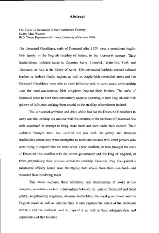 The Desmond Geraldines, earls of Desmond after 1329, were a prominent Anglo- Irish family in the English lordship of Ireland in the fourteenth century. Their landholdings included lands in Counties Kerry, Limerick, Waterford, Cork and Tipperary, as well as the liberty of Kerry. This substantial lordship crossed cultural borders to include Gaelic regions as well as Anglo-Irish controlled areas and the Desmond Geraldines were able to exert influence and, in some cases, overlordship over the semi-autonomous Irish kingdoms beyond their borders. The earls of Desmond seem to have been particularly adept at operating in both English and Irish spheres of influence, making them crucial to the stability of southwest Ireland. The substantial ambition and drive which had led the Desmond Geraldines to carve out this lordship did not end with the creation of the earldom of Desmond: the earls continued to attempt to bring more lands and men under their control. Their ambition brought them into conflict not just with the gentry and absentee landholders whom they were attempting to dominate but also with other powers who were trying to expand into the same areas. These conflicts, in turn, brought the earls of Desmond into conflict with the crown government and the king of England, at times jeopardising their position within the lordship. However, they also gained a substantial affinity drawn from the region; both drawn from their own lands and recruited from bordering lands. This thesis explores these ambitions and relationships. It looks at the complex, sometimes violent, relationships between the earls of Desmond and local gentry, neighbouring magnates, absentee landholders, the royal government and the English crown as well as with the Irish. įt also explores the extent of the Desmond lordship and the methods used to expand it as well as their administration and exploitation of that lordship.