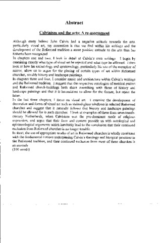 Although many believe John Calvin had a negative attitude towards the arts, particularly visual art, my contention is that we find within his writings and the development of the Reformed tradition a more positive attitude, to the arts than has hitherto been recognized. In chapters one and two, I look in detail at Calvin's own writings. I begin by examining exactly what type of visual art he rejected and what type he affirmed. I then look at how his eschatology and epistemology, particularly his use of the metaphor of mirror, allow us to argue for the placing of certain types of art within Reformed churches, notably history and landscape paintings. In chapters three and four, I consider music and architecture within Calvin's writings and the Reformed tradition. I suggest that the respective ontologies of metrical psalms and Reformed church-buildings both share something with those of history and landscape paintings and that it is inconsistent to allow for the former, but reject the latter. In the last three chapters, I focus on visual art. I examine the development of decoration and forms of visual art such as stained-glass windows in selected Reformed churches and suggest that it naturally follows that history and landscape paintings should be allowed for in such churches. I look at examples of these from seventeenth- century Netherlands, when Calvinism was the pre-dominant mode of religious expression, and argue that their form and content provide us with ontological and epistemological arguments which inevitably lead to the conclusion that their continued exclusion from Reformed churches is no longer tenable. In short, the use of appropriate works of art in Reformed churches is wholly consistent with the fundamental notions underpinning Calvin's theology and liturgical practices in the Reformed tradition, and their continued exclusion from most of these churches is an anomaly.