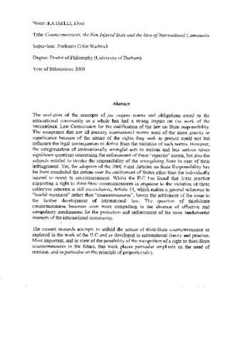 The evolution of the concepts of jus cogens norms and obligations owed to the international community as a whole has had a strong impact on the work of the International Law Commission for the codification of the law on State responsibility. The acceptance that not all primary international norms were of the same gravity or significance because of the nature of the rights they seek to protect could not but influence the legal consequences to derive from the violation of such norms. However, the categorization of internationally wrongful acts to serious and less serious raises significant questions concerning the enforcement of these 'superior' norms, but also the subjects entitled to invoke the responsibility of the wrongdoing State in case of their infringement. Yet, the adoption of the 2001 Final Articles on State Responsibility has far from concluded the debate over the entitlement of States other than the individually injured to resort to countermeasures. Whilst the ILC has found that State practice supporting a right to third-State countermeasures in response to the violation of these collective interests is still inconclusive, Article 54, which makes a general reference to "lawful measures" rather than "countermeasures", leaves the settlement of the issue to the further development of international law. The question of third-State countermeasures becomes even more compelling in the absence of effective and compulsory mechanisms for the protection and enforcement of the most fundamental interests of the international community. The current research attempts to unfold the notion of third-State countermeasures as explored in the work of the ILC and as developed in international theory and practice. Most important, and in view of the possibility of the recognition of a right to third-State countermeasures in the future, this work places particular emphasis on the need of restraint, and in particular on the principle of proportionality.